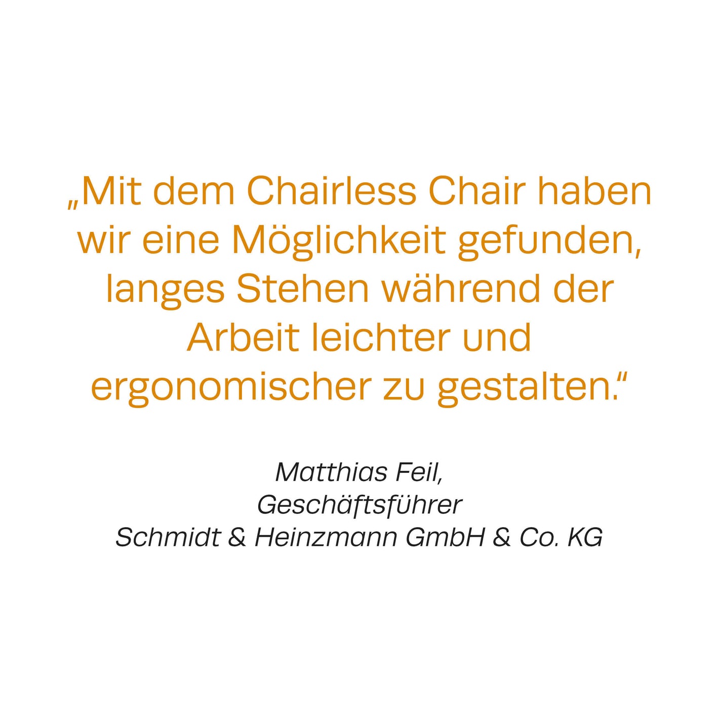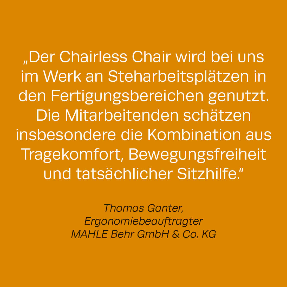 Inzwischen nutzen nahezu alle großen Automobilhersteller sowie weitere namhafte Unternehmen verschiedenster Branchen weltweit den Chairless Chair. Gemeinsam mit unseren Partnern aus der Industrie haben wir einen Prozess entwickelt, wie wir den Chairless Chair gemeinsam mit Ihnen optimal in Ihrem Unternehmen einführen können. Ein persönliches Training vor Ort oder online sowie eine Arbeitsplatzanalyse gehören dabei unbedingt dazu. So stellen wir sicher, dass der Chairless Chair optimal eingesetzt wird und sich Ihre Mitarbeiter wohl fühlen. Also: Rufen Sie uns einfach unverbindlich an, wir beraten Sie gerne… übrigens auch zu Finanzierungsmöglichkeiten oder unseren Mietmodellen.